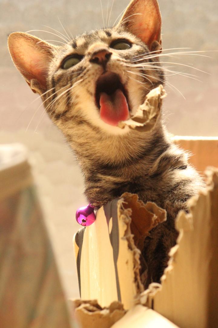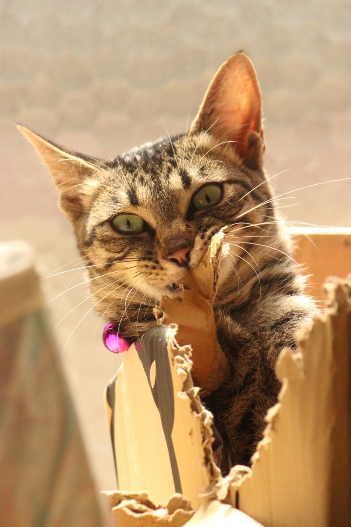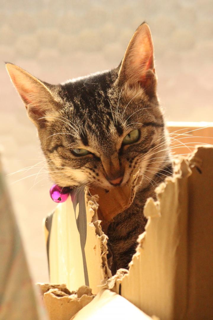 恐ろしい悪顔で段ボール噛み噛みしてます