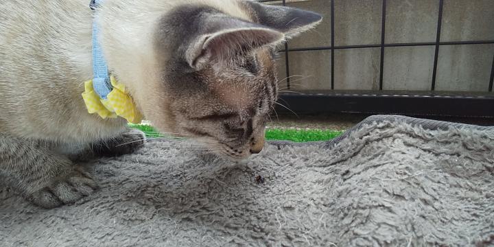 そして、もう少し小さいカミキリムシっぽい謎の虫がいたので、見せてあげたらあっという間にパクり🐱