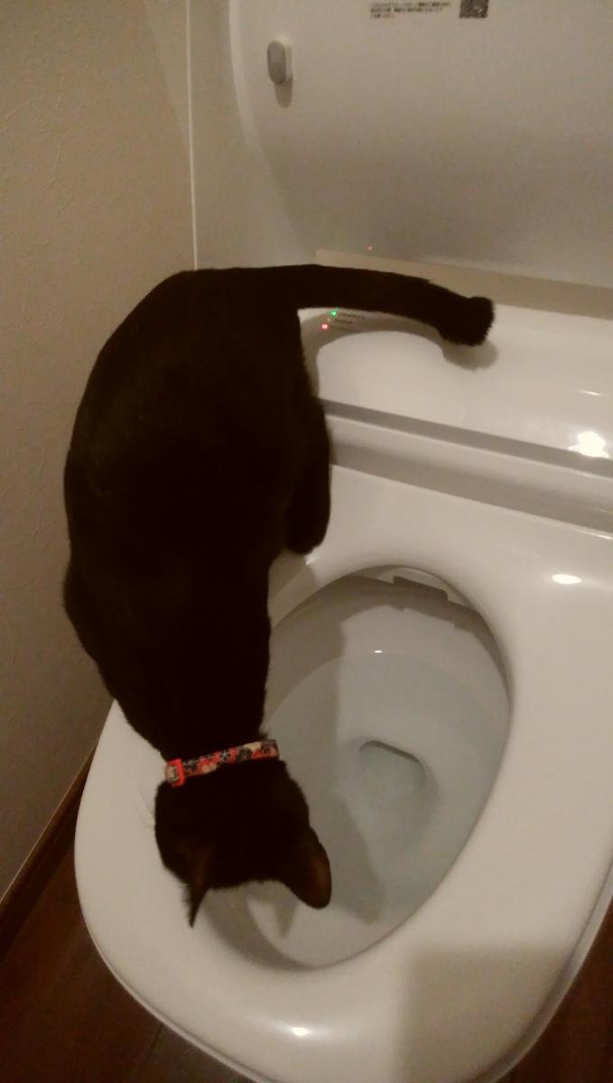 黒猫クーは🚻に入るとすっ飛んできて、背中に乗って私のパンツ上げ(?)を邪魔していましたが、最近は水流しに興味津々😰。