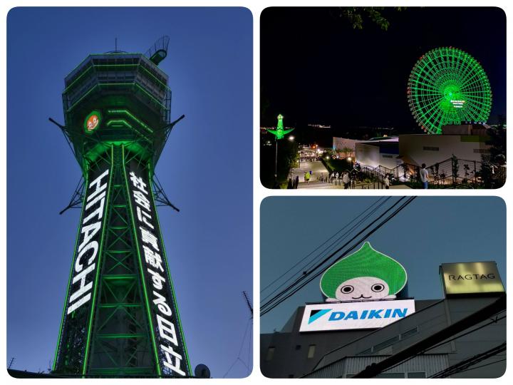 「大阪モデル」7日間達成で、緑色のライトアップ、通天閣と、太陽の塔&エキスポシティの観覧車