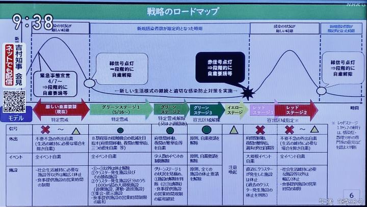 知事の21時過ぎの会見をテレビで見ていたけど、グリーンステージも3段階作ってあり、今回の出口戦略だけでなく、この後来るやもしれない第2波、第3波に向けての「入口戦略」でもあるということで、戦略ロードマップだそう。