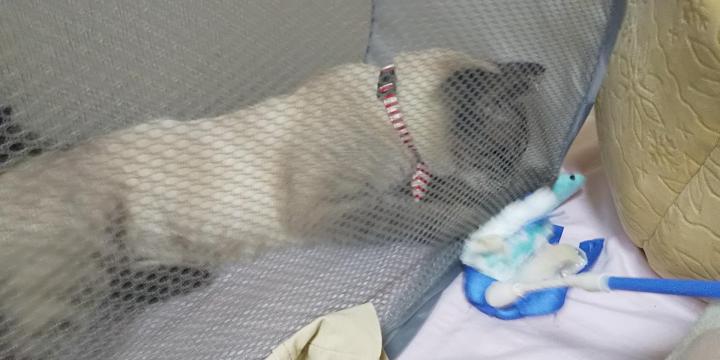 寝ないけど、入ってご機嫌だったり、中のタグをアムアムして遊んでます