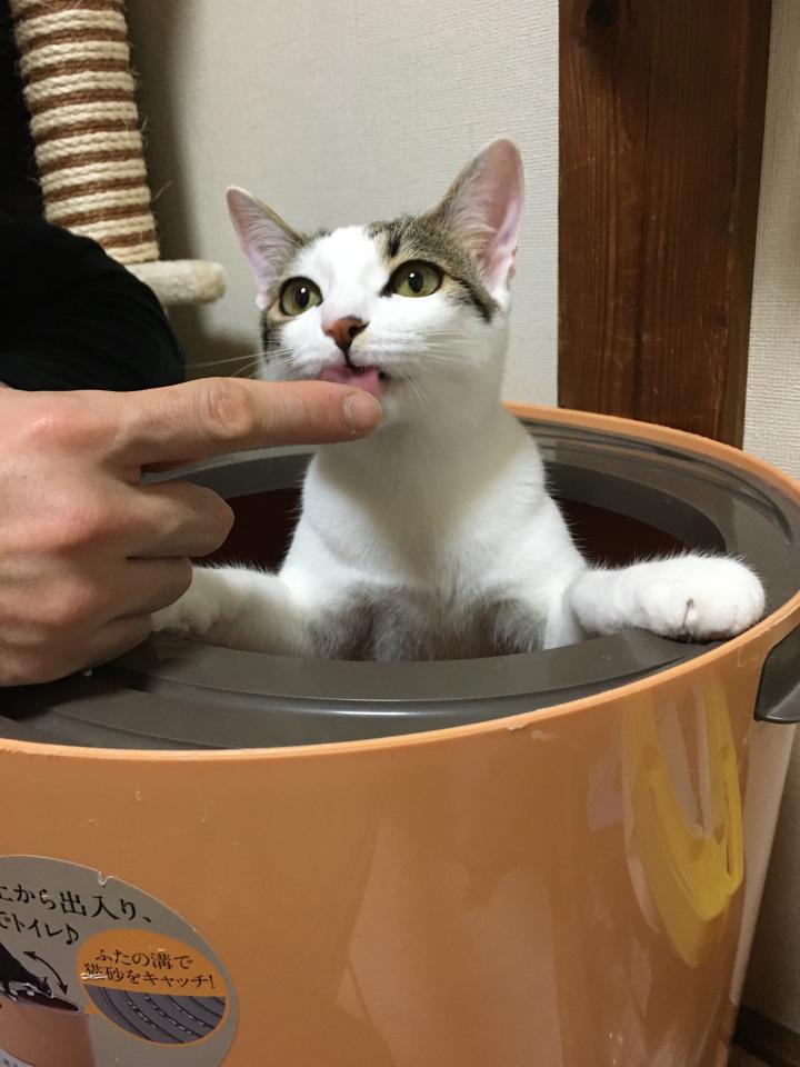 何故かトイレの中からひょっこりしてちゅーるを食べる子がいました😓