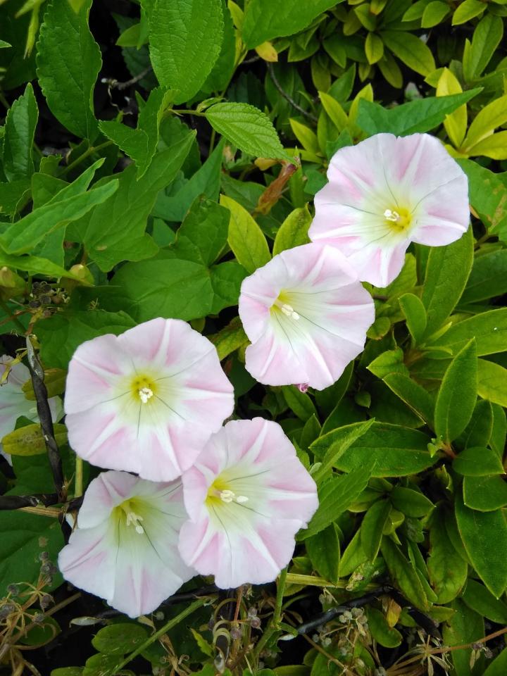 コヒルガオです。道端のツツジの植栽に咲いていました。