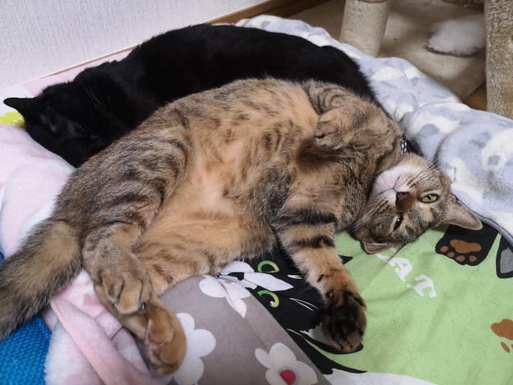 昨年作った夏用ベッド出したら、そこで仲良く寝てる。