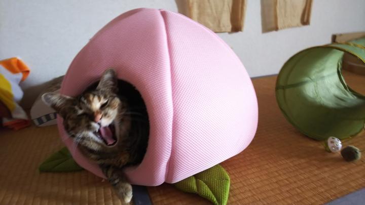 暑くなってきたので、桃(メッシュの猫ベッド)を出したら、姫ちゃんが入ってました。