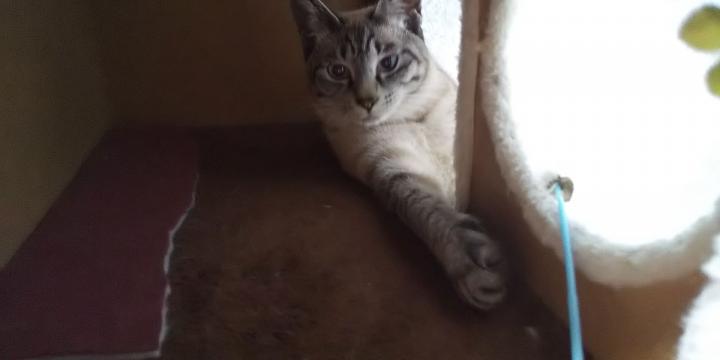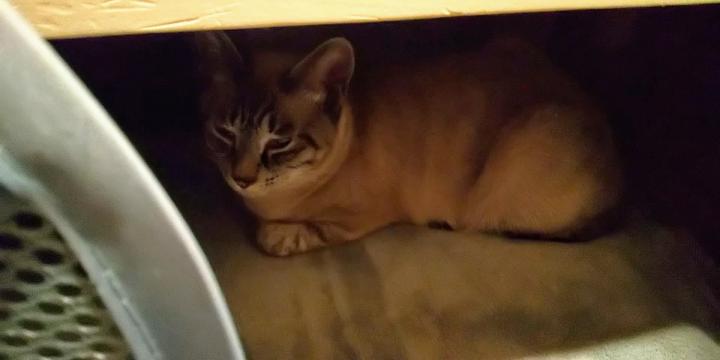このキャットタワーのキャットハウスは、布をかけたらものすごい隠れるように。