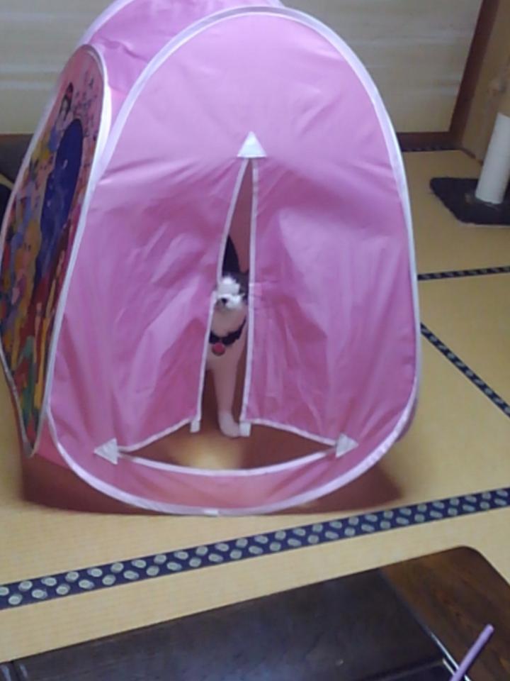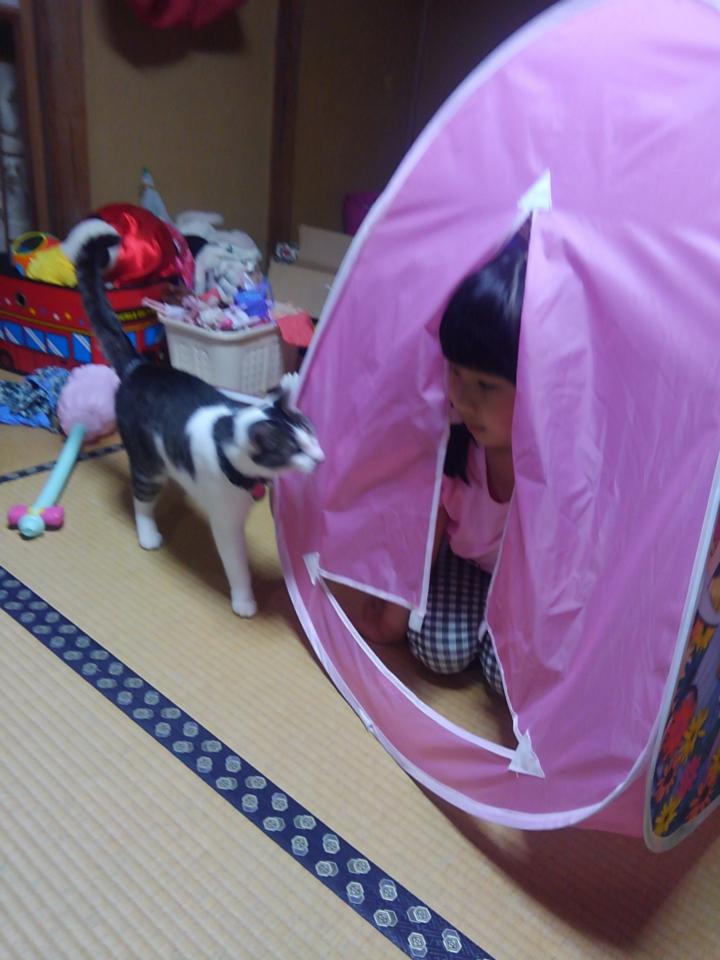 おいしいご飯より、娘たちがもらってきたオモチャのテントに興味津々。