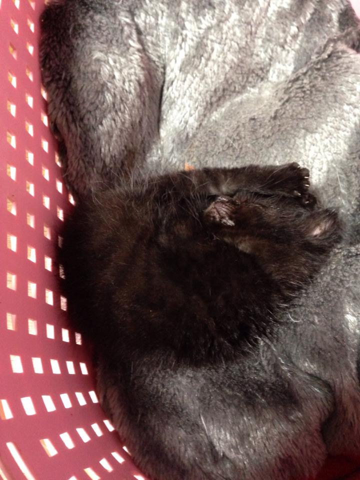 『親と逸れたこの子猫を何とかしてくれ』と黒い生後1カ月位の子猫を連れて来ました。目やにが凄くて、猫風邪をひいて居る状態。