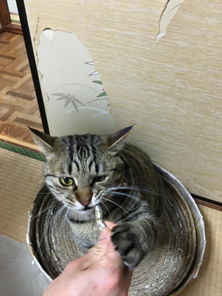手で催促しながらイカツイ顔してキビナゴを食べるゲン。