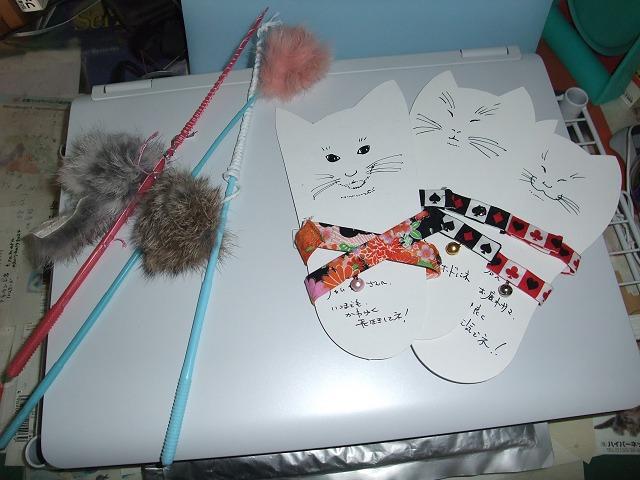 大きな荷物が届いたので不思議に思って開けてみると、中にはセーターやカーディガンなど冬用のお洋服と、手作り首輪とうさぎ毛の猫じゃらしが出てきました。