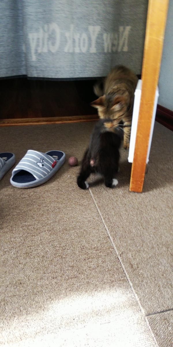 子猫のちょこまか動くかわいさに、次男くんメロメロです…。