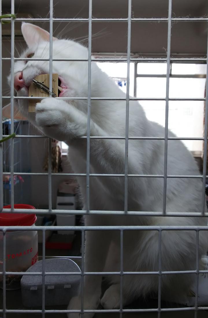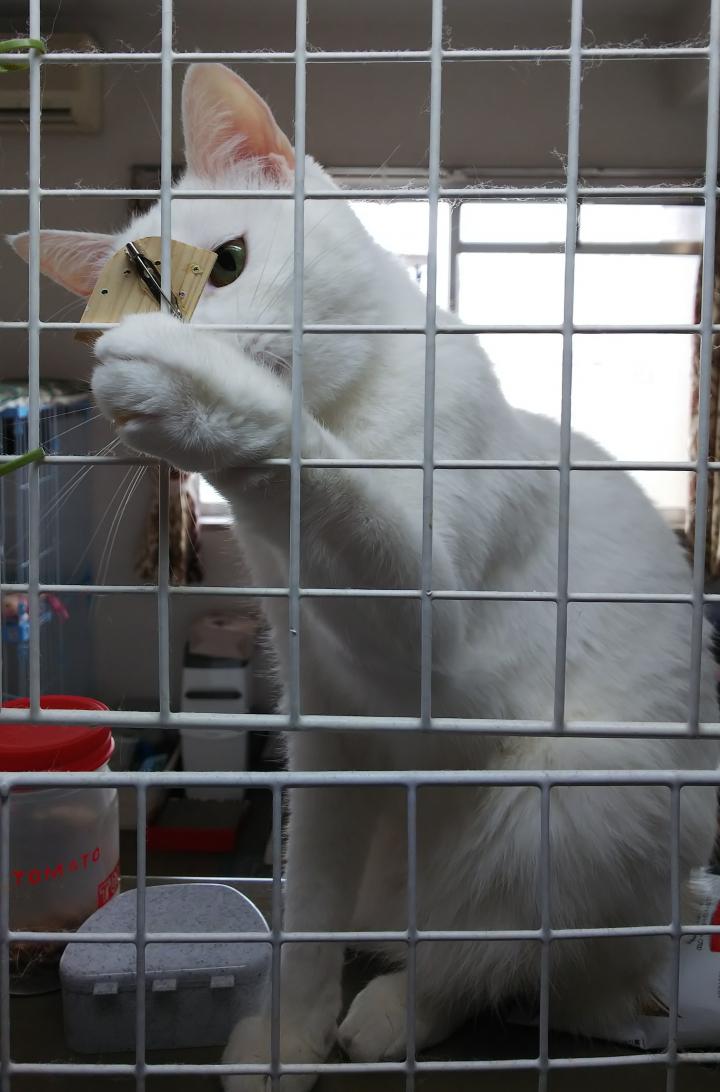 猫達が台所に入らないように、柵をしています。そこに、職場の方(の、ご親戚作)からいただいたブローチをつけているのですが、ちーちゃんが気になるようで。