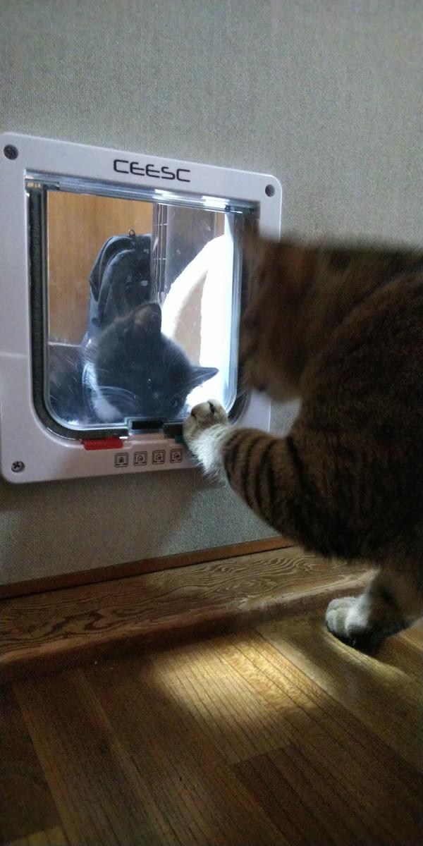 元気なので遊びたいんだけど…先住猫ベルと窓越しに!お見合いしております。