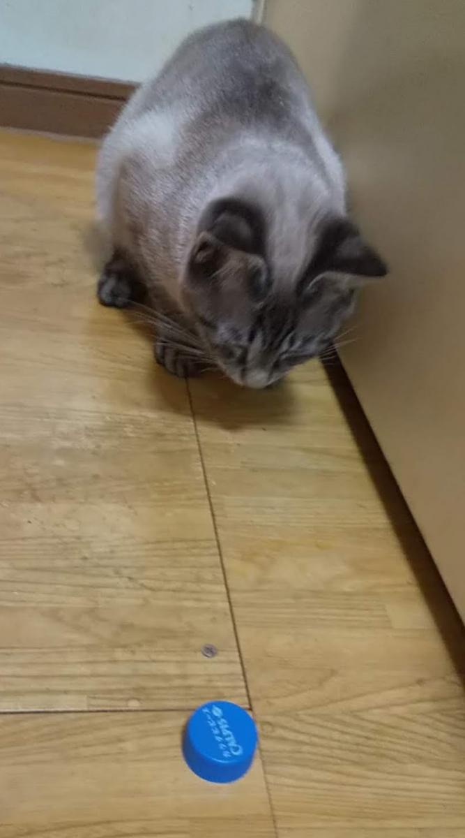 わざとトイレのドアの下にペットボトルキャップを入れて出すのがお気に入りのようです(笑)