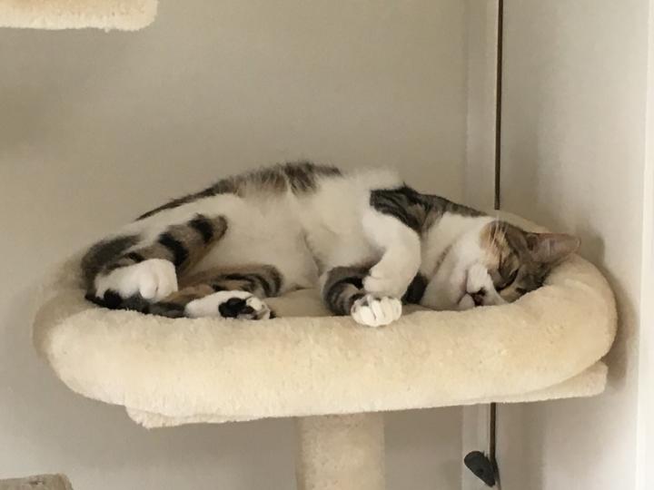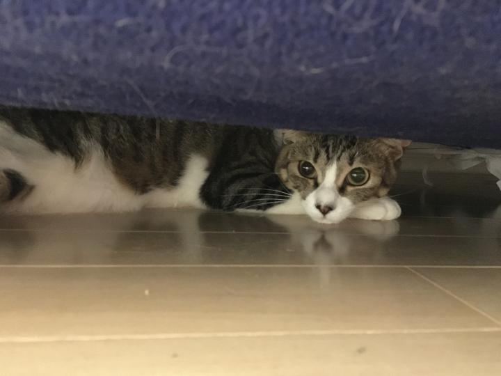 最近のお気に入りのいたずらは、トイレのドアを全身で飛び乗って開けること。外からカギしてるから大丈夫だけど、ブラーんって。