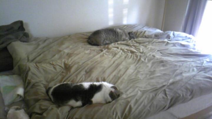 昼寝中のにゃどん(手前)、ばんじろう(奥)。