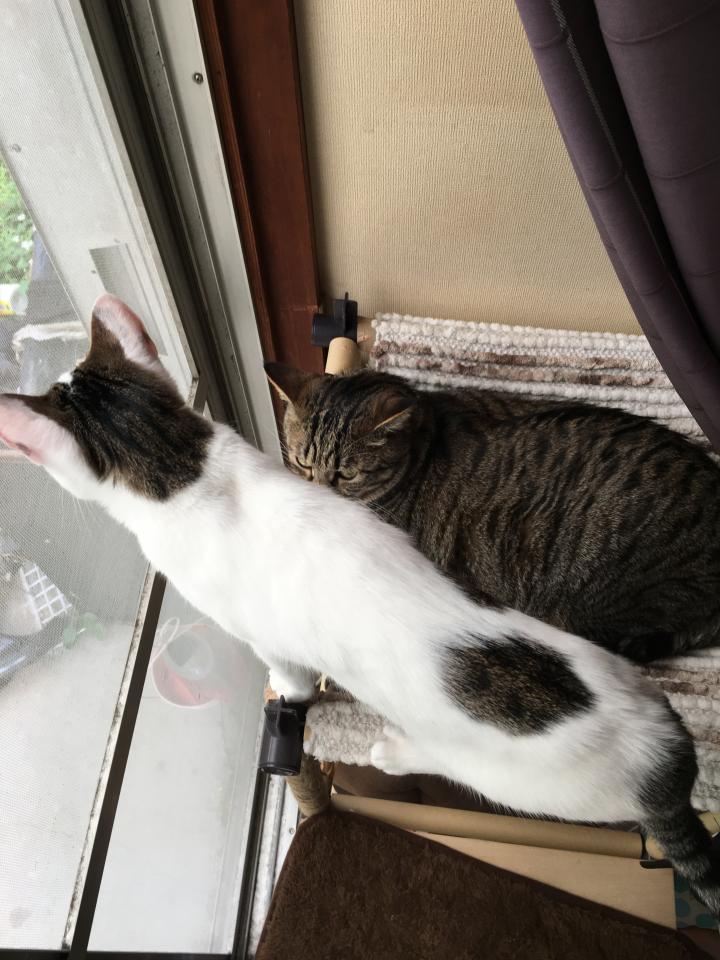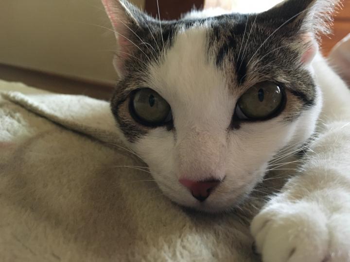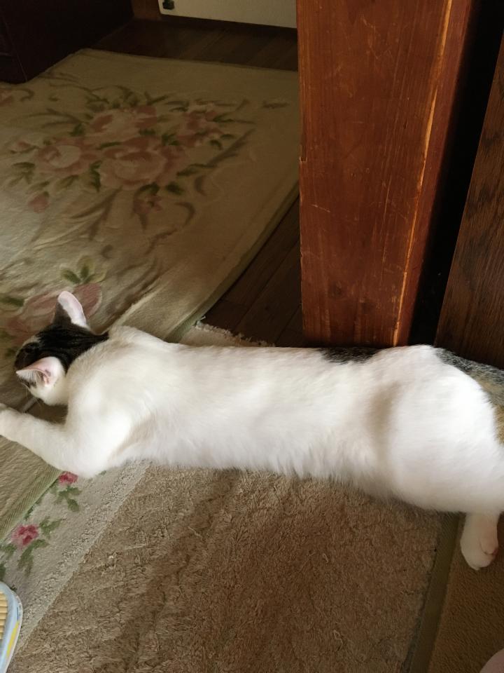 で、結局ゲンに追い出されたミルクは私の近くで長い伸びて寛いでおりました🤣