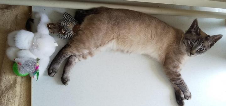 自分のタイミングで入れておいたご飯を食べますが、その前に遊んでにゃーがあって