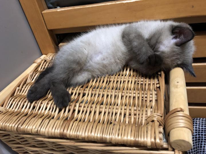 私の料理中は、後ろにあるバスケットの上でよく寝ています。片付けようと思ってたけど、片付けられなくなってしまった…