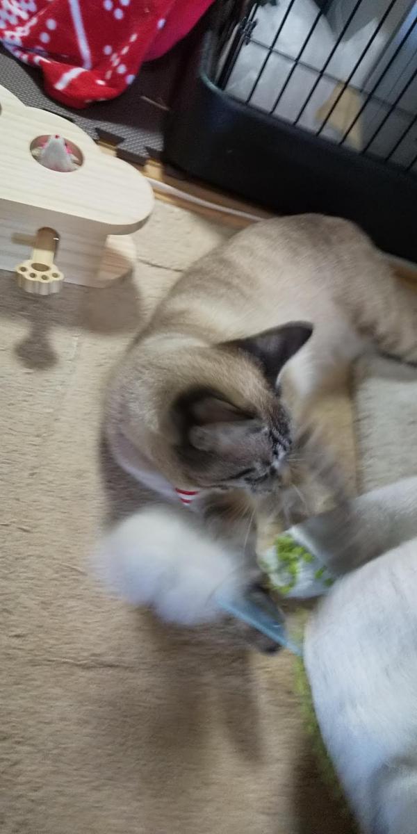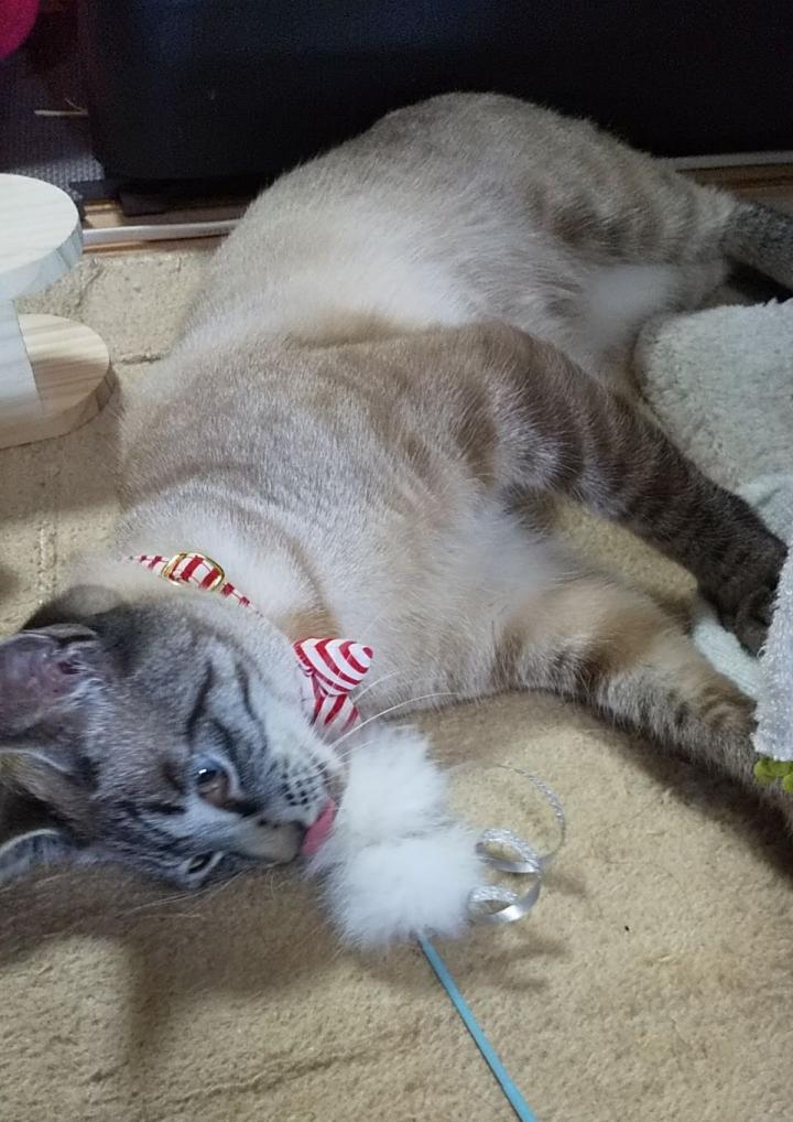 いっぱい猫じゃらししてあげたら、ゼリーのウェットをペロリ👅