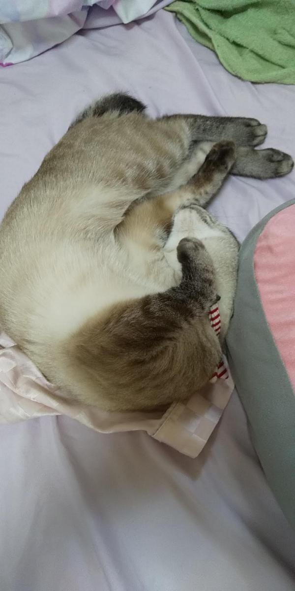 お兄ちゃんが学校へ行ったら寂しくなったのか、今日は珍しくベッドでお昼寝・・・