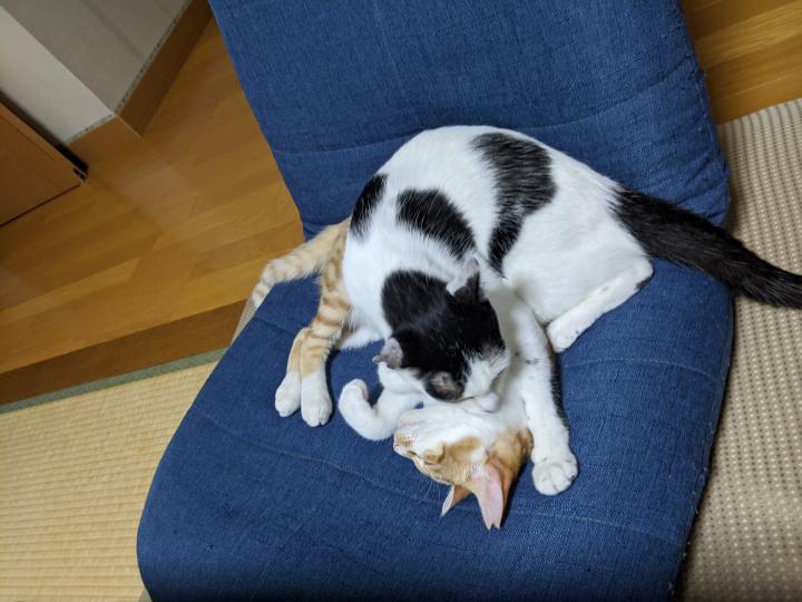 いつもキッツからアロ・グルーミングするし、猫プロレスでは手加減してる感じ。弟のワガママを優しく見守るお兄ちゃん。