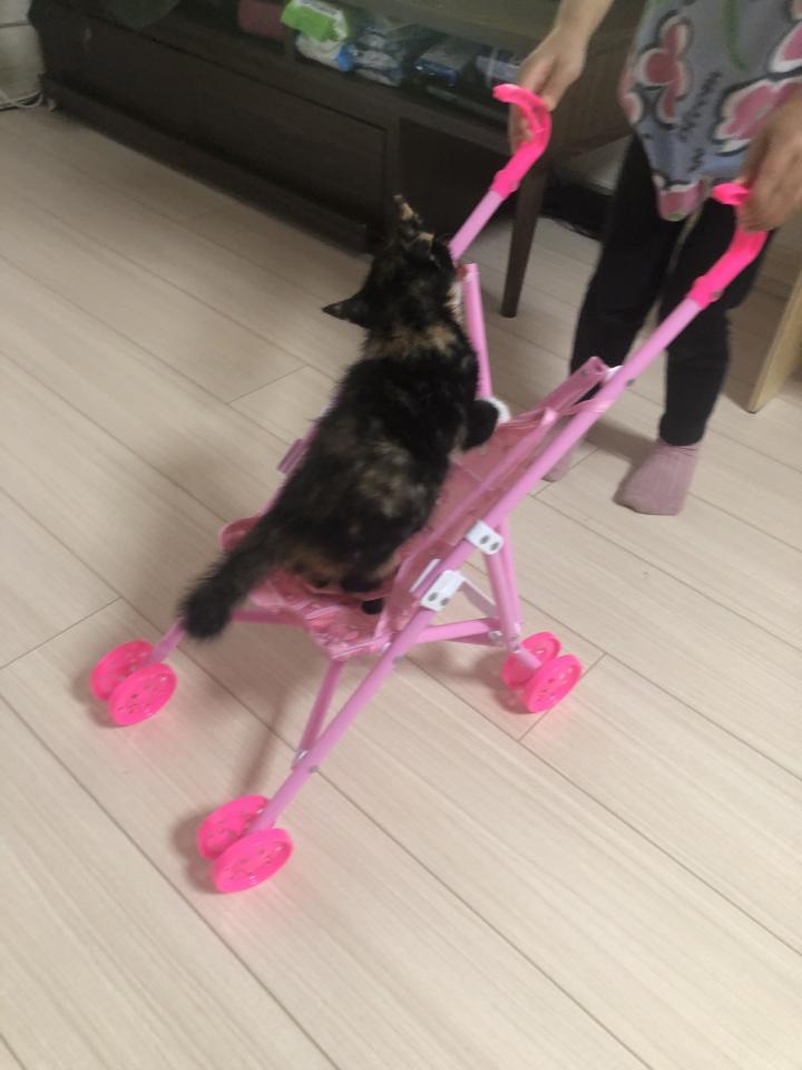 おもちゃのベビーカー に乗せられて初めは嫌がっていたけど