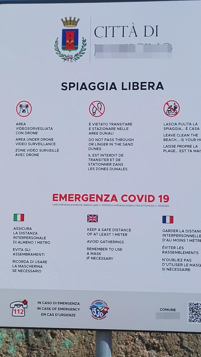 わずかに残る無料ビーチの注意書き、今年はCOVID19についても