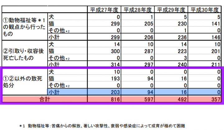 ※東京都では、動物福祉等の観点から行ったもの及び引取・収容後に死亡したものを【除く】致死処分を「殺処分」と表現しています。