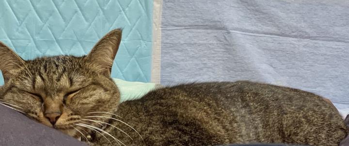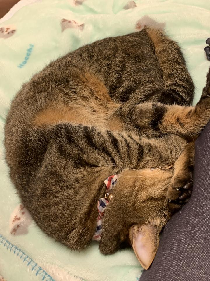 お昼寝しようとベッドに横になると、すかさずやってきて最近の定位置、私の股の間にきて寝ます。