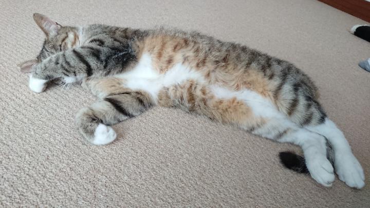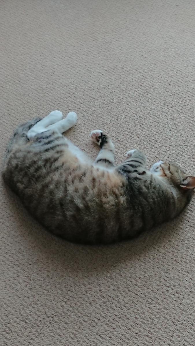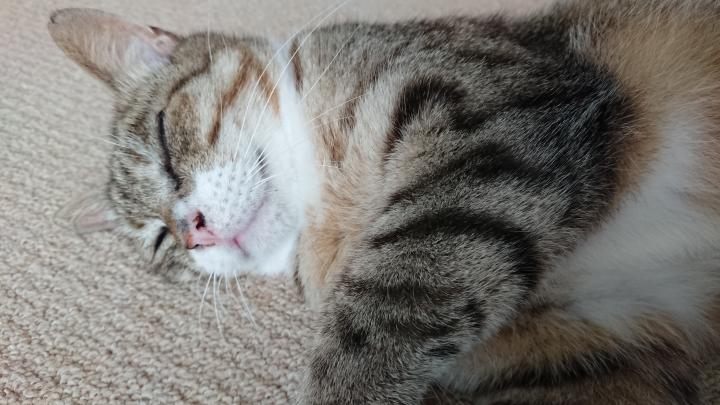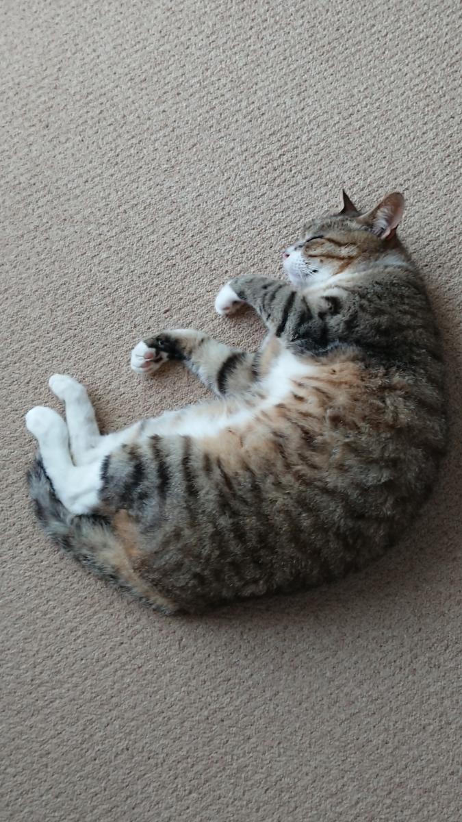 先程お洗濯物部屋に行くと、そのまま横になったまま熟睡中の猫3号。