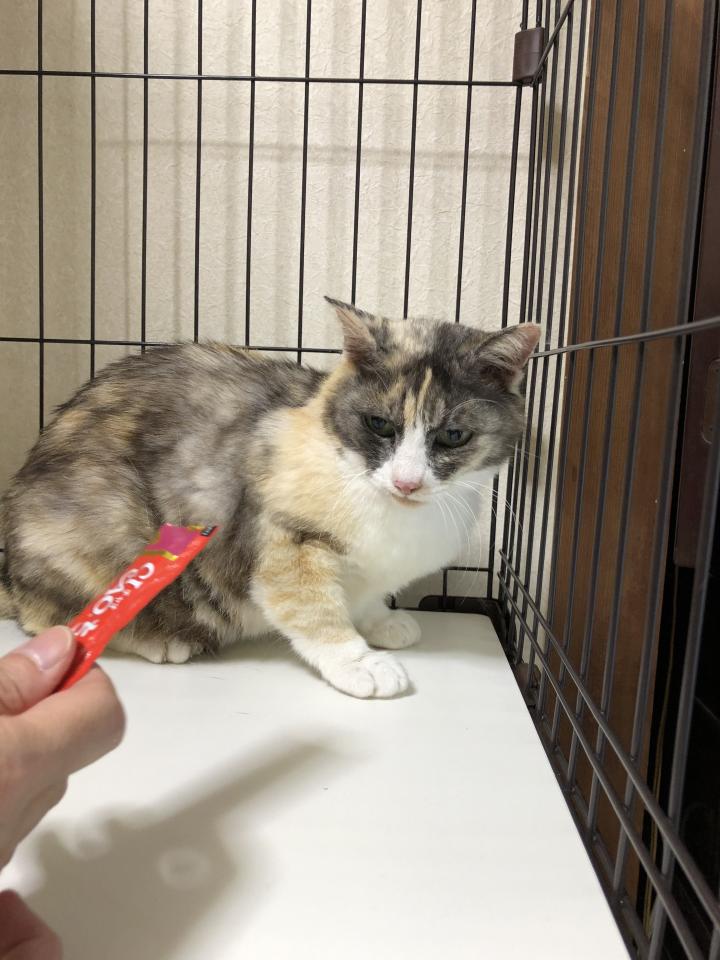 写真は病院から帰ってすぐにちゅーるでご機嫌をとっているところです。