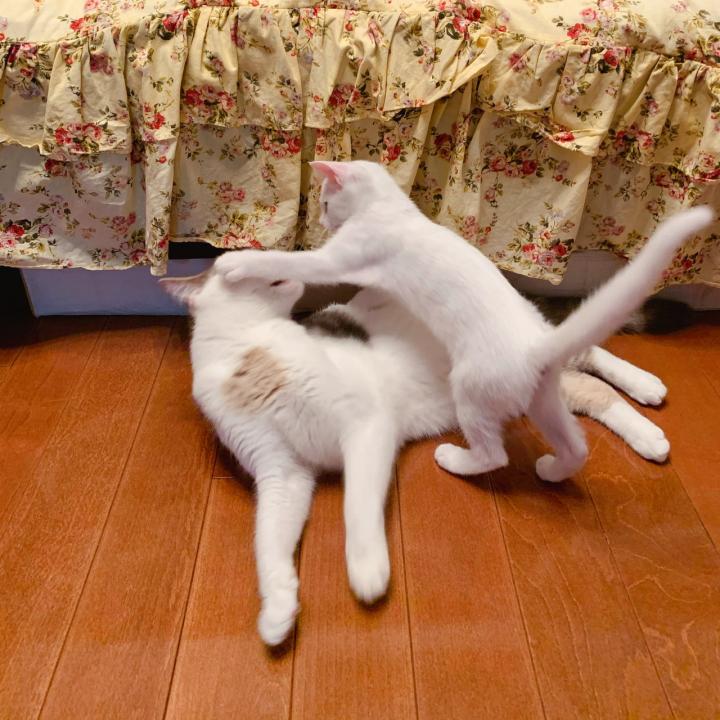 怪我をしないよう、爪を切ったり、2人が一緒の時は目を離さないようにしたり、ヒートアップした時は気をそらすようなおもちゃを投げ入れたり。