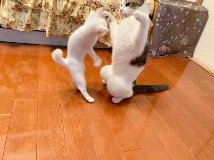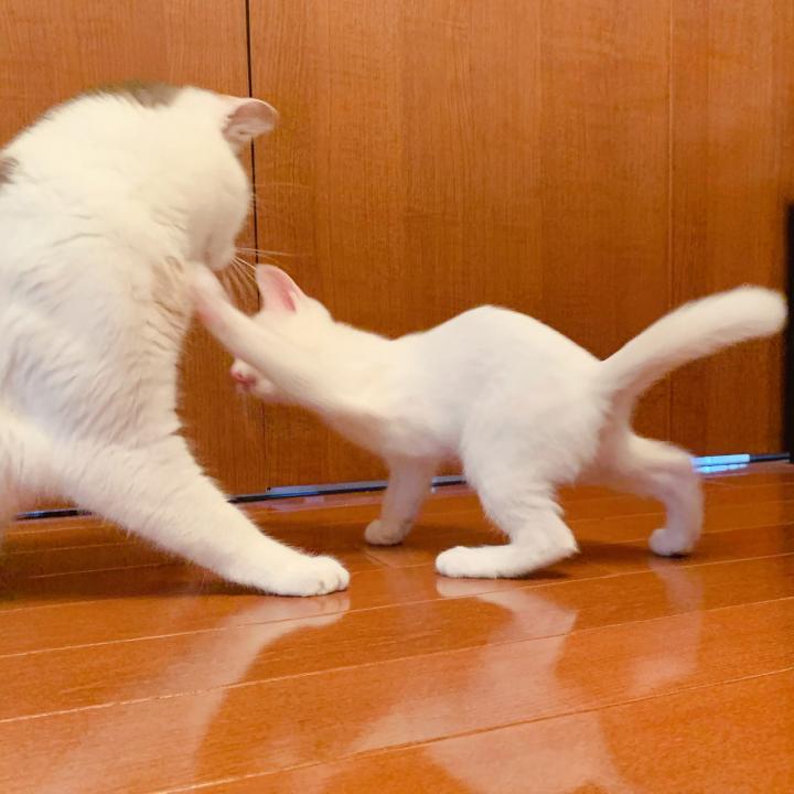 さすがのおっとり先住猫も、我慢が限界に達すると、払いのけたり、パンチで返したり、降伏させるの如く押さえ込んだりしています。