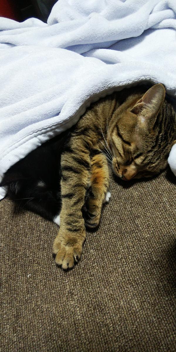 昨夜の様子。猫じゃらしで遊んで疲れたのか…隣で寝てました。