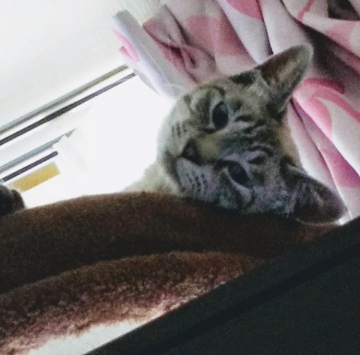 起きたらシャルルも 起きたにゃ?とキャットタワーからのぞき込んでいます。