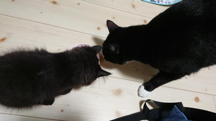 大福さんのごはんは横取りするが、高虎君のご飯は飽きるまで待つ虎徹。