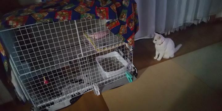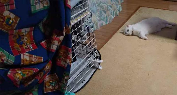 ジルくんがケージから出せと中で暴れているのを、セナちゃんはマッタリと見学しています。