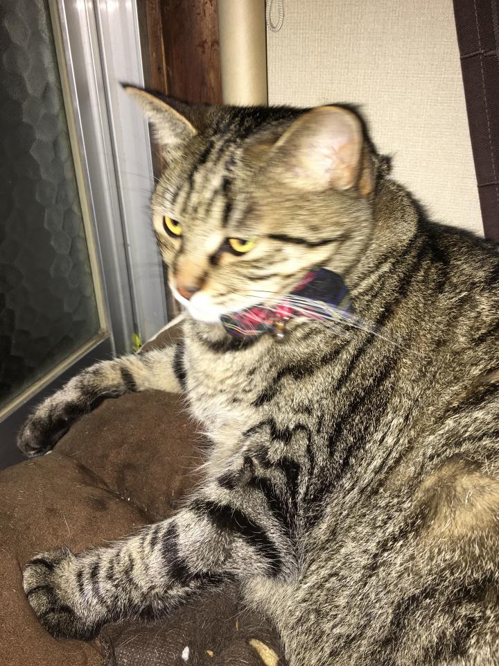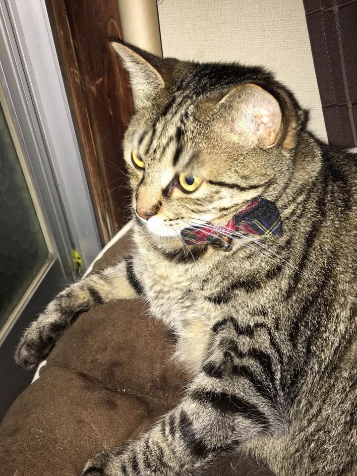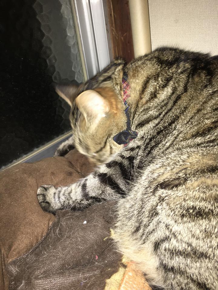 そして、遊ぶのに満足して夕飯を食べたゲンは一階キャットタワーにておとーさんが帰って来るのをひたすら待つ😓