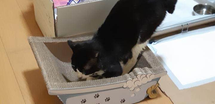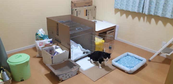 ケージを囲ってるダンボールが悪いのはわかってるんですが、シイちゃんはまだ去勢されてない子なので、万が一のことを考えて、トイレが置いてあるケージをガードしてます。