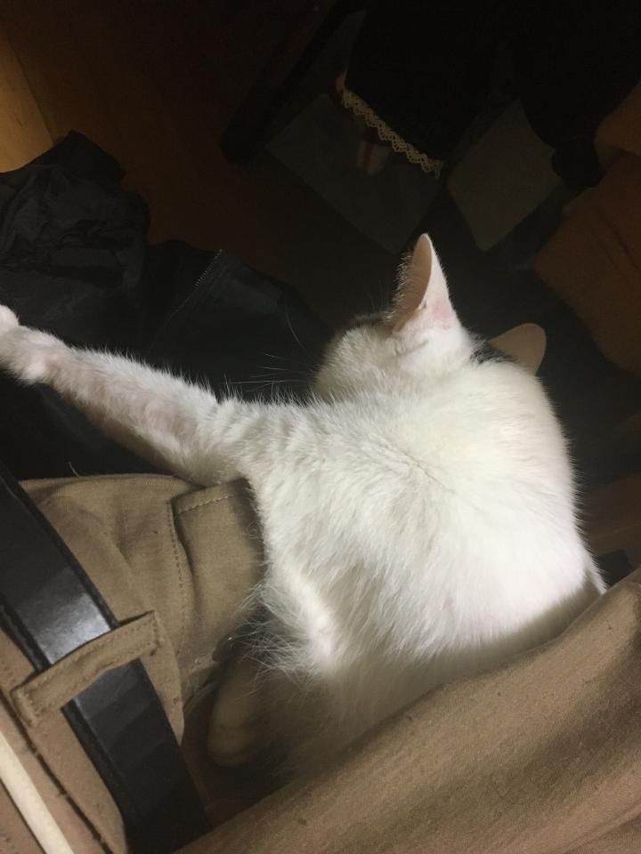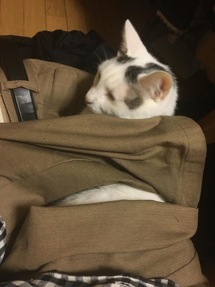↑写真は、脱ぎ捨ててあったお父さん(夫)のズボンにくるまるロア。