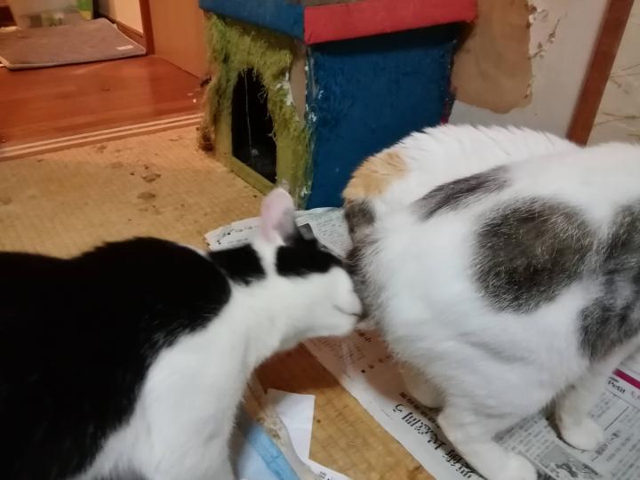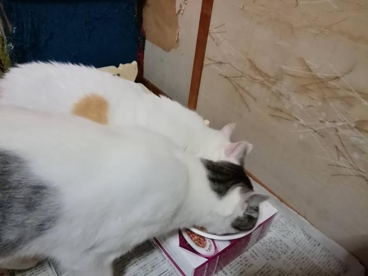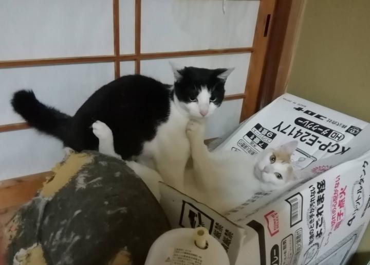 あまり長引くようなら止めるかな、と見ていたら、2にゃんの重さに耐えかねた段ボールがひしゃげ、2匹はレフェリーストップとなりました。