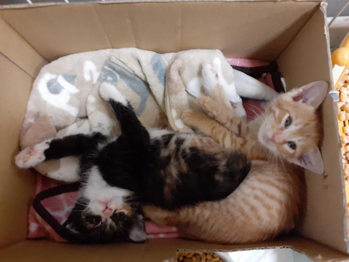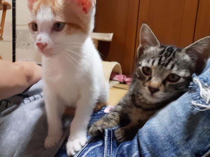 そして今月頭に保護した姉弟子猫、三毛子と麦茶、本日夕方にお見合いです。