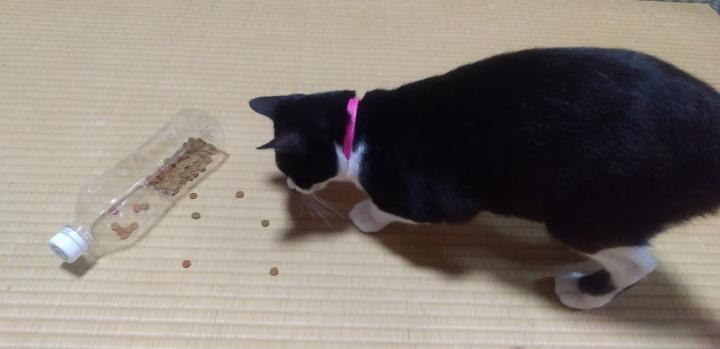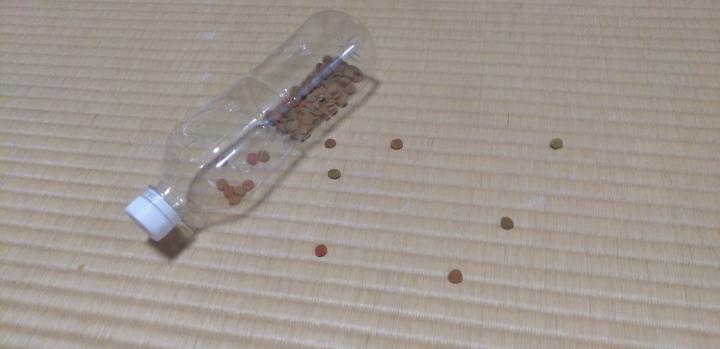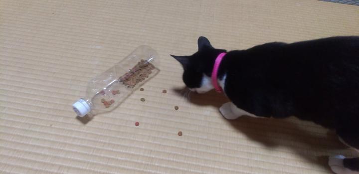 ペットボトルに穴あけて、その穴からカリカリがこぼれてきたのをちょっとずつ食べて、