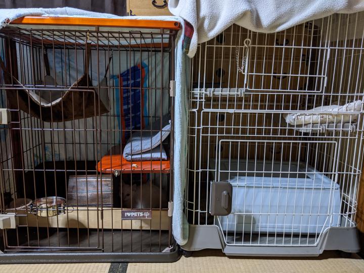 保護前に、私が使ってた和室を保護部屋にするために掃除とケージを組み立て!ケージのカバー代わりに古いタオルケットをミシンで、縫い合わせました。