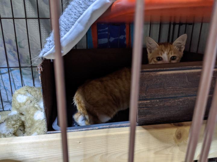 小さな茶白くんは、保護ケージの間を抜け出せるほど、小さい子猫で、兄弟猫でも結構大きさが違いました。(母猫と一匹の子猫の保護は一旦保留になりました)