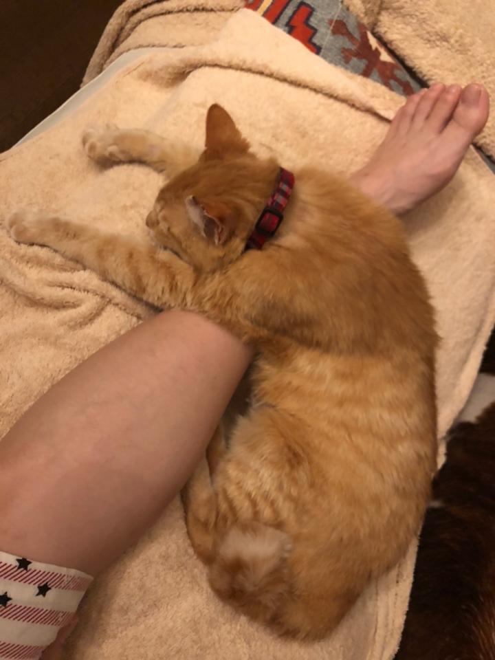 珍しい茶トラの小顔の女の子。ビビリですが慣れればスリスリ、ゴロゴロと可愛いですよ。シャーの威嚇をしたり噛み付いたりはしません。ハテナマークみたいな鍵しっぽです。毛並みよく柔らか。食いしん坊です。