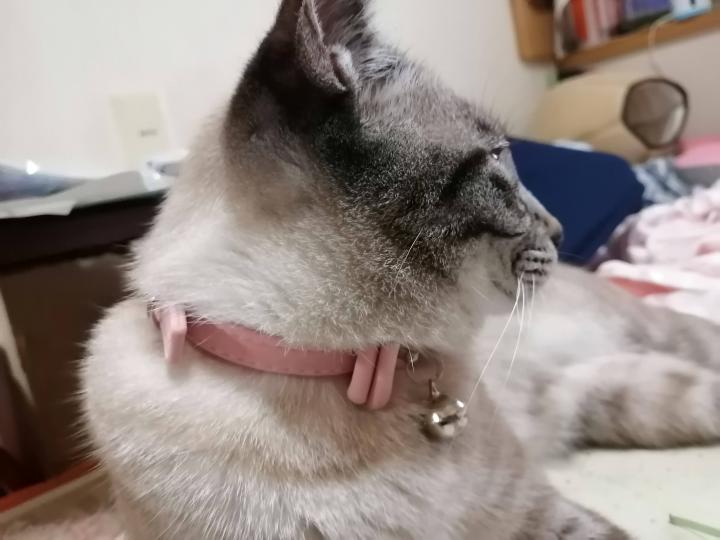 おニューの首輪をつけてみましたが、ちょっと鈴が大きかったかな?