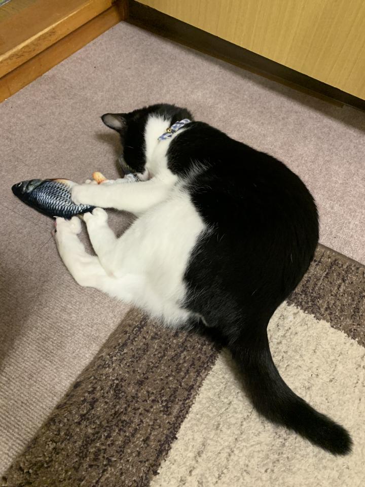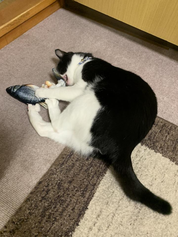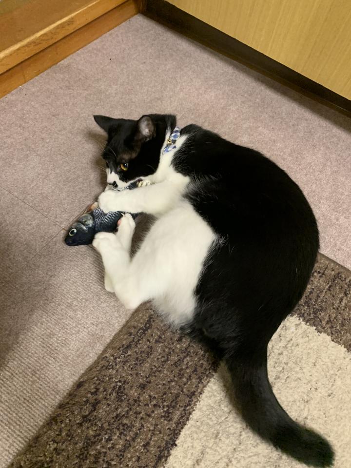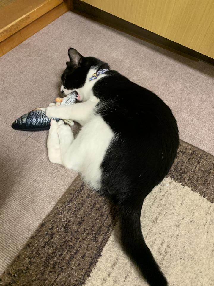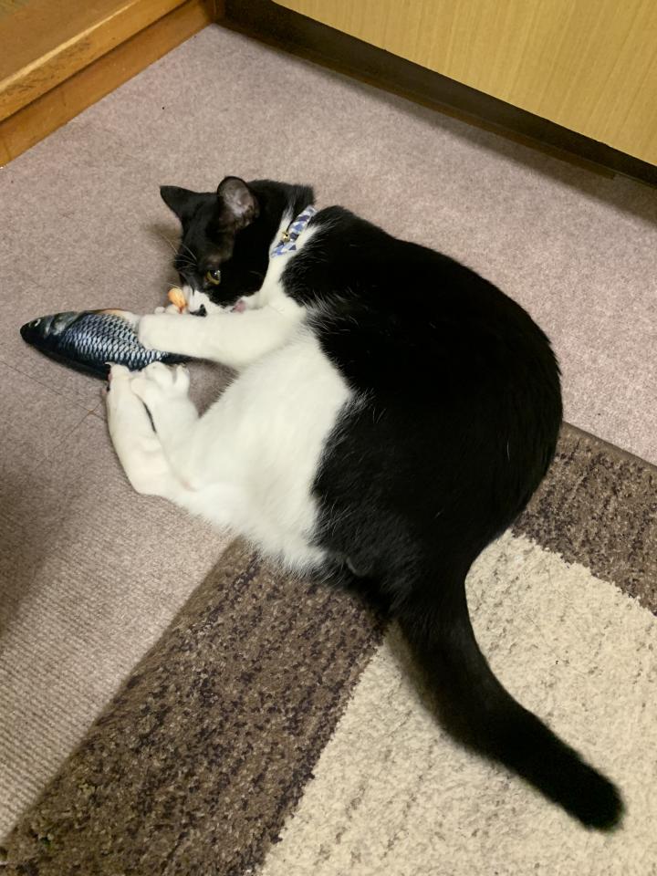 ビチビチ動くには充電しないといけないらしく、でもノンちゃんレンくんともにマタタビが入った魚で充分みたいで、食らいつく蹴る蹴る!!